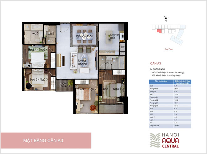 II. Thiết kếHanoi Aqua Central được thiết kế hài hòa về bố cục, trang nhã về màu sắc mang đến sự kết hợp hoàn hảo của một môi trường sống hiện đại đẳng cấp những nét thanh lịch, hào hoa trong phong cách sống của người Tràng An. Chiều cao mỗi tầng lên đến 6m giúp các căn hộ được tối đa hóa nguồn ánh sáng tự nhiên và tôn lên nét đẹp hiện đại của thiết kế. Mặt bằng tầng tại dự án có thiết kế vuông vắn và phần lớn căn hộ tại dự án đều có thiết kế 3 phòng ngủ với 2 đến 3 mặt thoáng.