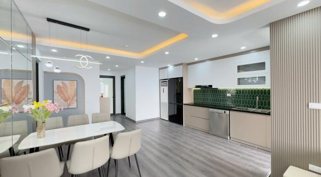 o Tủ bếp trên/dưới, bếp từ, máy hút mùi, bàn ăn hiện đại.