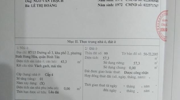 Chính chủ cần bán GẤP căn nhà 4x14 hẻm xe hơi P. Bình Hưng Hòa, Bình Tân