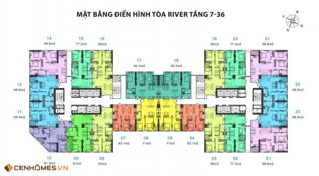 - Căn 2PN + 2WC: Từ 63m2 đến 77m2.