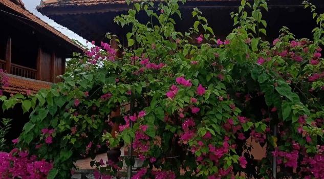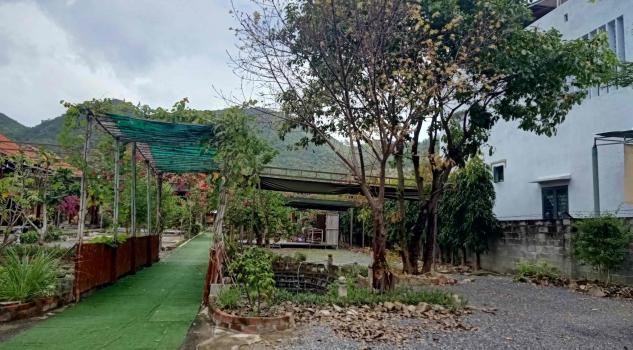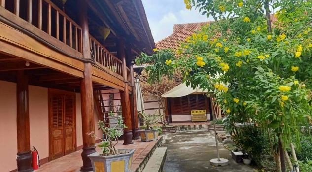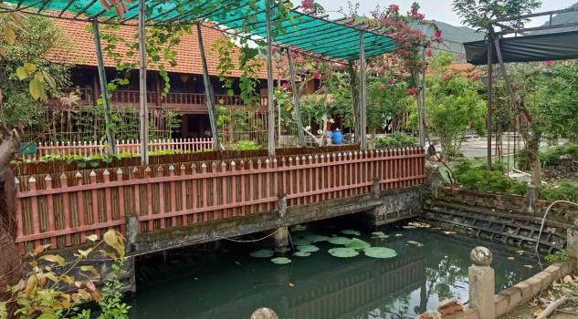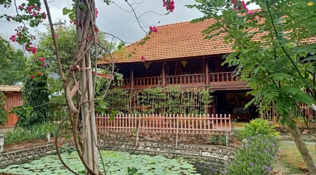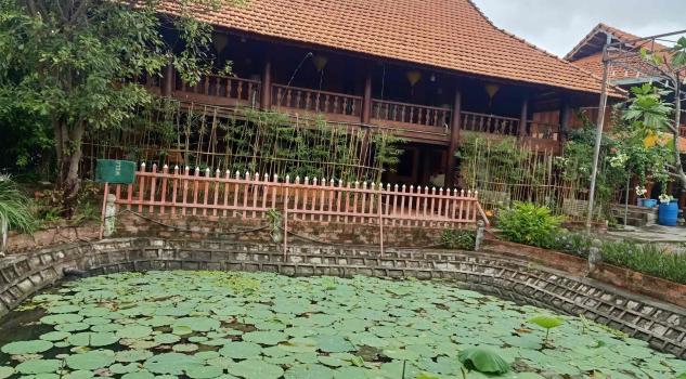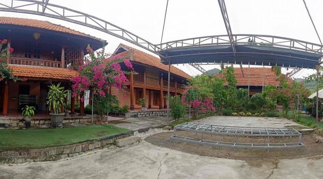 Mô tả: villa sở hữu cụm 04 căn nhà sàn xung quanh (với 3 nhà bên và 01 nhà chính ở giữa), cùng với hồ sen và sân rộng để sinh hoạt được trồng hoa rất đẹp ở giữa villa và quanh nhà.